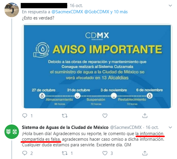 El Sistema de Aguas de la Ciudad de México aclaró que es falsa la información que se está compartiendo a través de redes sociales sobre un próximo corte de agua.