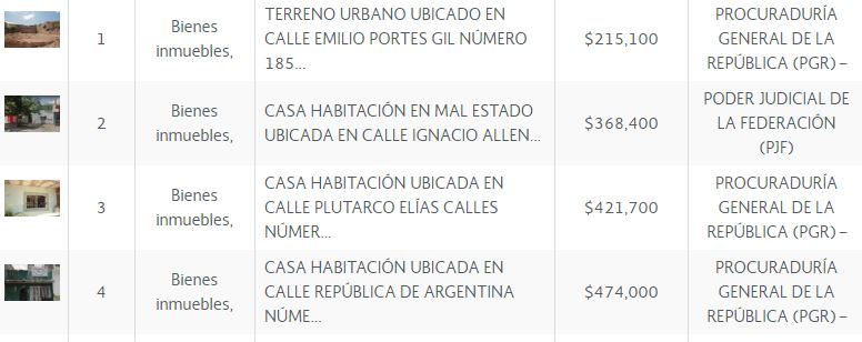 El inmueble de menor precio es un terreno urbano ubicado en Culiacán, Sinaloa, con un valor de salida de 215 mil 100 pesos. El lote de mayor precio de salida es el 26, que consiste en una finca en Naucalpan de Juárez, Estado de México, con un valor de salida de 32 millones 091 mil 533 pesos.