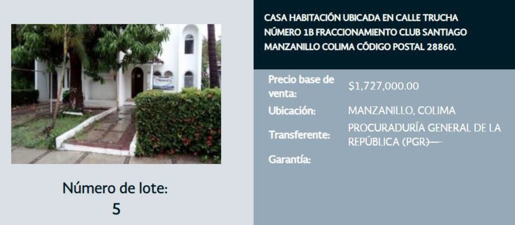 El inmueble de menor precio es un terreno urbano ubicado en Culiacán, Sinaloa, con un valor de salida de 215 mil 100 pesos. El lote de mayor precio de salida es el 26, que consiste en una finca en Naucalpan de Juárez, Estado de México, con un valor de salida de 32 millones 091 mil 533 pesos.