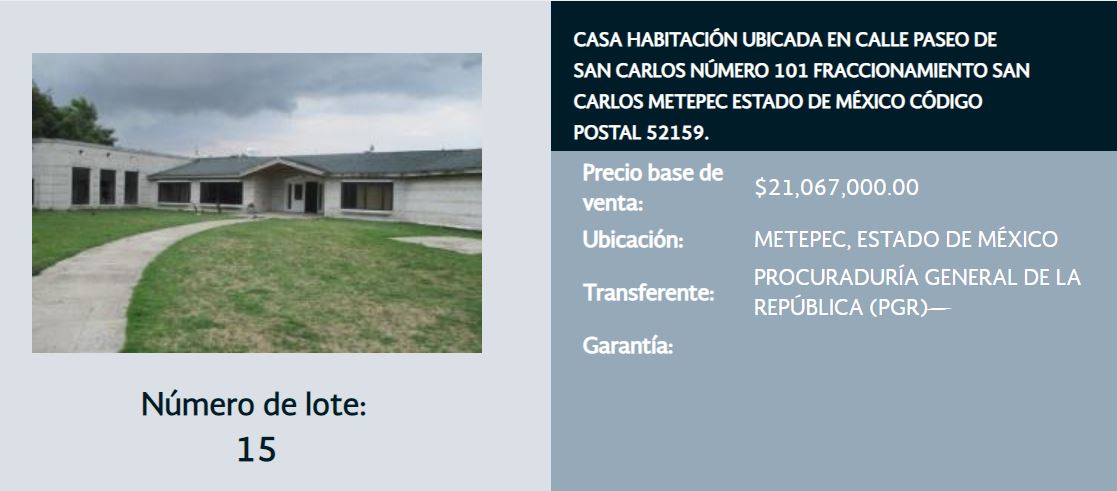 El inmueble de menor precio es un terreno urbano ubicado en Culiacán, Sinaloa, con un valor de salida de 215 mil 100 pesos. El lote de mayor precio de salida es el 26, que consiste en una finca en Naucalpan de Juárez, Estado de México, con un valor de salida de 32 millones 091 mil 533 pesos.