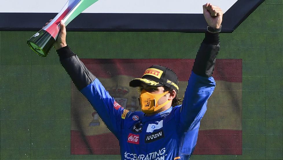 Carlos podía luchar por todo. El peligro estaba en Bottas, que estaba detrás de Norris y podría ir a por el triunfo. Pero ni los cambios que le hicieron al coche del nórdico durante el parón por bandera roja le sirvieron al finlandés para mejorar su ritmo. Carlos tenía la oportunidad de su vida y quedaban 27 giros. La carrera se reanudó en parado, en otra parrilla de salida en la que el madrileño lo volvió a bordar, sin errores. Si quería ganar tenía que hacerlo adelantando en pista e iba a por ello. En la segunda salida, Carlos mantuvo una gran lucha con Stroll de la que salió victorioso. Poco después, Giovinazzi cumplía su sanción en la vuelta 31 y Hamilton había hecho lo propio para dejar a Sainz en tercera posición. Tenía entonces por delante a Kimi Raikkonen, al que pasó adelantó de forma espectacular en la primera chicane del circuito. Era segundo y ya solo le quedaba por delante el Alpha Tauri de Gasly.