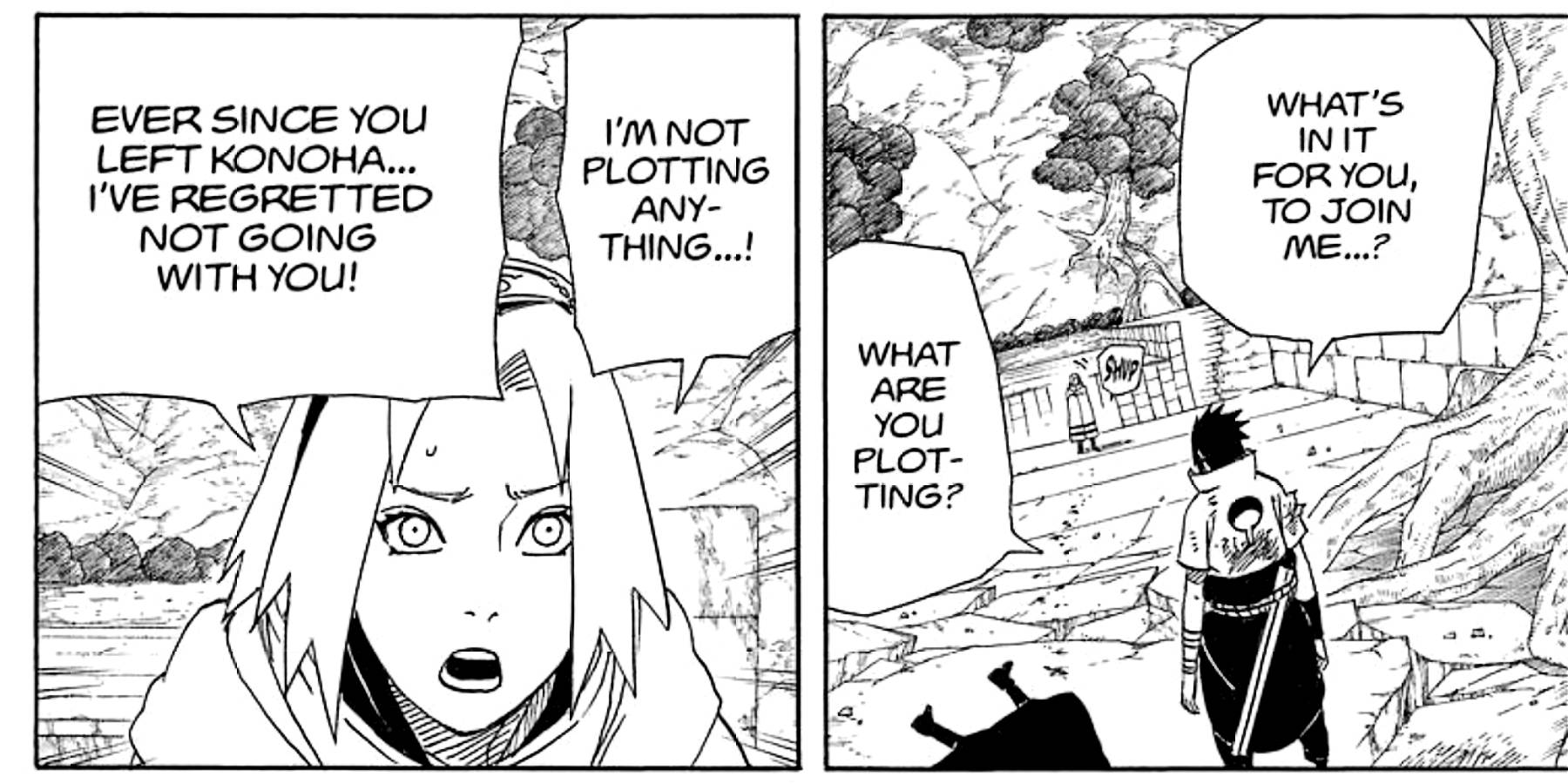 Sin embargo, el amor es una emoción poderosa, quizás la más poderosa, y si la incorruptibilidad de Sakura tuviera una debilidad, ciertamente habría sido su amor por Sasuke. A lo largo de la saga, Sakura afirma más de una vez que haría casi cualquier cosa para quedarse con Sasuke, especialmente si eso finalmente lo llevaría a regresar a la comunidad de Konoha como un ciudadano modelo.