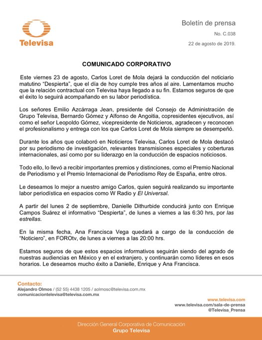 “Este viernes dejaré de trabajar en Noticieros Televisa. Sé que es una decisión difícil para la empresa y para mí, por eso agradezco mucho el apoyo y la libertad que tuve durante 18 años para construir y dirigir los espacios noticiosos que encabecé”, comentó el conductor de noticias, Carlos Loret de Mola.