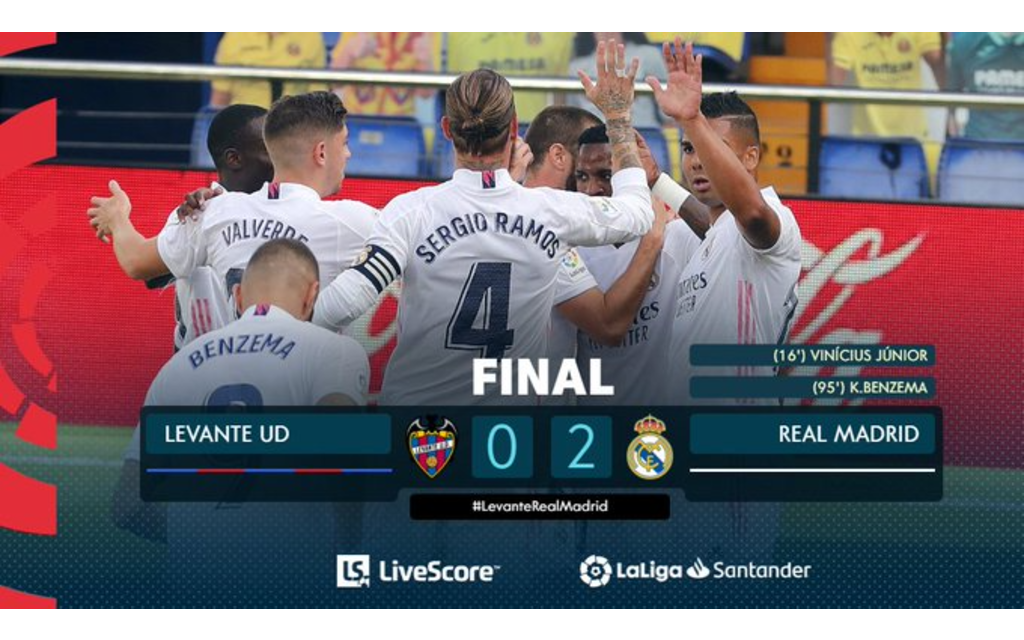 Real Madrid se impuso como visitante 0-2 ante Levante en el Estadio La Cerámica, su cuarto partido en la Liga de España, resultado que le permite conservar el invicto y escalar al liderato general con un partido menos.
