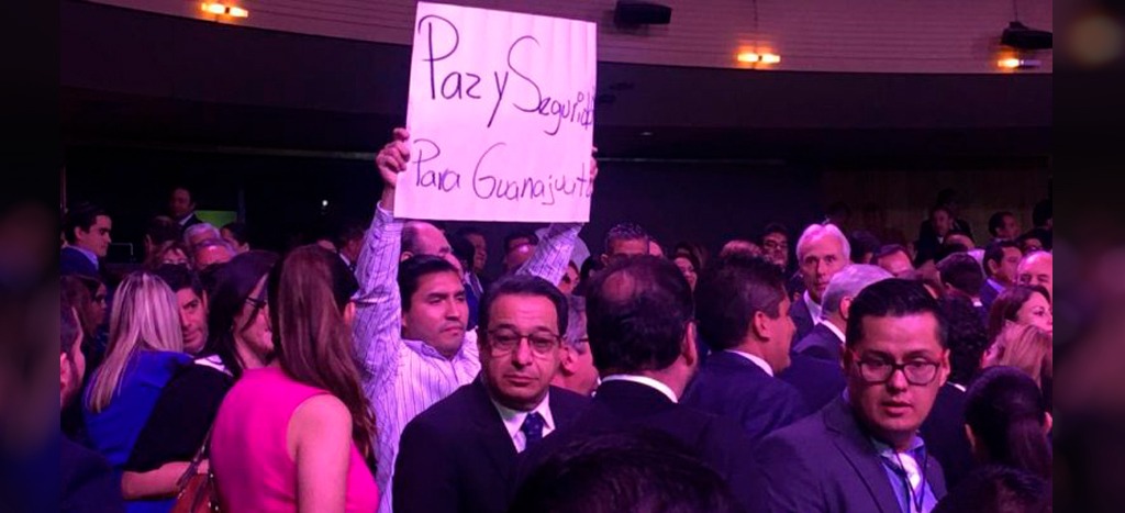 Francisco logró acceder al acto a pesar de no contar con una invitación. Adentro sacó una cartulina en la que se leía “Paz y Seguridad para Guanajuato”.