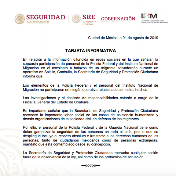 En un comunicado conjunto, ambas dependencias manifestaron: “En relación a la información difundida en redes sociales, en la que señalan la supuesta participación de personal de la Policía Federal y del Instituto Nacional de Migración en el asesinato a balazos de un migrante salvadoreño durante un operativo en Saltillo, Coahuila, la Secretaría de Seguridad y Protección Ciudadana informa que: los elementos de la Policía Federal y el personal del Instituto Nacional de Migración no participaron en ningún operativo relacionado con estos hechos”.