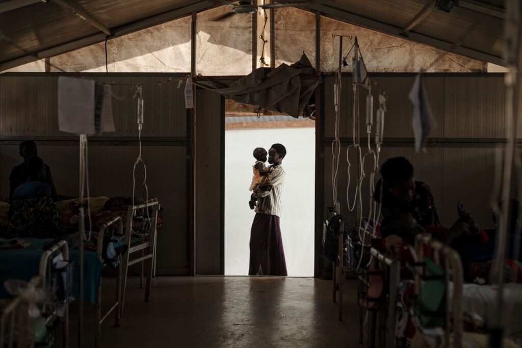Nyanhial observa a su bebé Chuong durante la exploración de los sanitarios. Todos los niños en el hospital tienen un problema secundario de desnutrición. “Hay muchas personas en las zonas rurales atrapadas y sin ayuda. No pueden venir aquí. Los niños que ves aquí son los afortunados. La gente camina durante días en el agua para llegar”, explica el oficial clínico Koang Elijah.Sean Sutton (MSF)