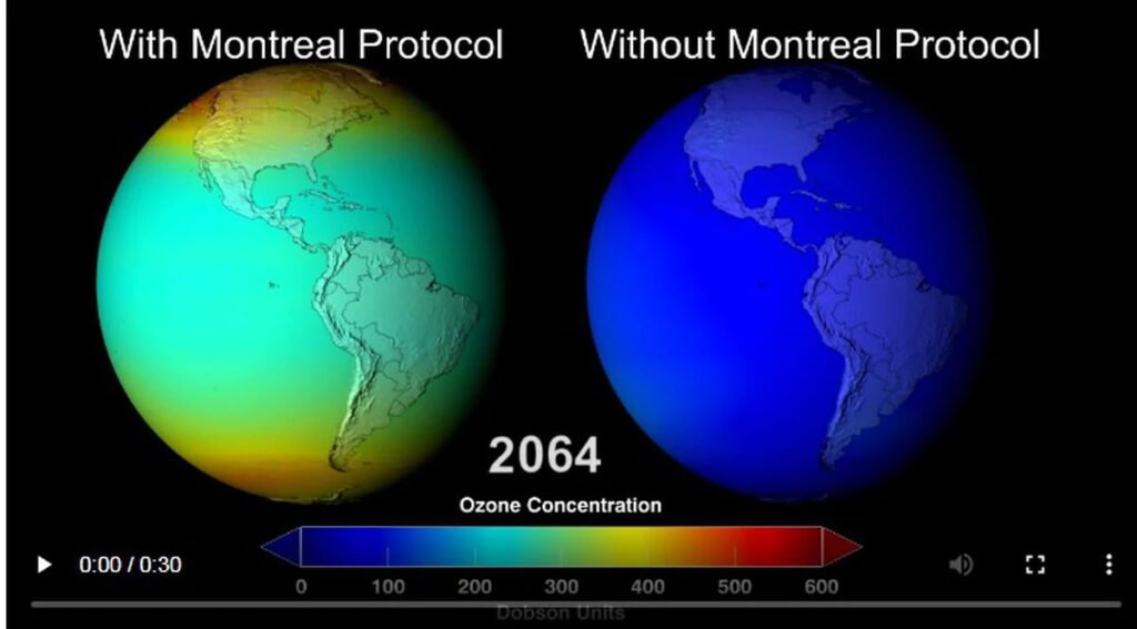 El protocolo de Montreal no nació como un tratado contra el cambio climático, pero según un estudio publicado en 2019 por el Instituto de Física en el Reino Unido, ha sido ocho veces más efectivo que otros acuerdos diseñados específicamente para reducir las emisiones de gases de efecto invernadero, como el protocolo de Kioto de 1997. Según Paul Young, los gobiernos pueden aprender muchas lecciones del protocolo de Montreal: “Es verdad que la capa de ozono es un problema distinto que el cambio climático. Por lo que respeta al ozono, estamos hablando de un pequeño grupo de sustancias químicas producidas por un pequeño grupo de compañías. Aunque en ese momento no existían sustitutos, las mismas compañías fueron capaces de producirlos. En cambio, cuando hablamos de CO₂, es la base de toda nuestra economía y no puede ser reemplazado. Es un conflicto mucho más difícil de resolver”. Al mismo tiempo, reflexiona el científico, sí que podemos extraer una conclusión positiva del protocolo de Montreal: “La comunidad científica descubrió que había un problema, y el mundo se puso de acuerdo para lidiar con ese problema lo más urgentemente posible. Es un ejemplo victorioso de cooperación internacional basada en el conocimiento científico”.