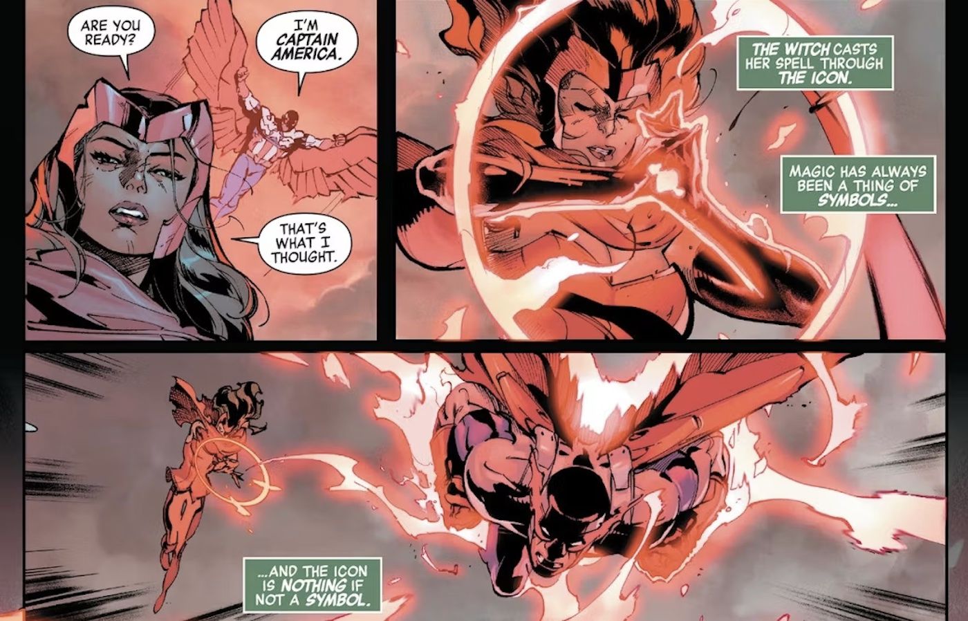 En Vengadores #7, Scarlet Witch lanza su hechizo basándose enteramente en esa verdad. En la pesadilla en la que están atrapados, se hace referencia a Sam como “El icono” y eso es literalmente en lo que Wanda lo convierte. Toda la esperanza, la creencia y la desesperación que quedan en los Estados Unidos de América se convierten en su hechizo. Incluso con toda la realidad colapsando y “pudriéndose en los bordes”, La gente todavía tiene fe en el Capitán América. Scarlet Witch los envía a la batalla con él, en cierto modo, y el arma que empuña solo existe gracias a ellos. Wanda tejió la magia, pero no habría hilo sin la profunda fe que la gente tiene en The Icon.