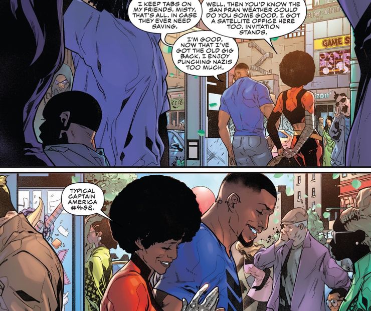 En Capitán América: símbolo de la verdad por Tochi Onyebuchi y RB Silva, el Capitán América de Sam Wilson y el Halcón de Joaquín Torres tienen la misión de evitar que una organización criminal transporte el Suero del Súper Soldado usando la información que les dio Misty Knight. Cuando los criminales aparentemente lanzan una emboscada contra Falcon y el Capitán América, Sam queda inconsciente, momento en el que el problema lleva a los fanáticos al momento en que Misty le cuenta por primera vez a Sam sobre el envío ilegal del Suero del Súper Soldado, que resulta ser más revelador. de lo que se supuso originalmente. Wilson se reúne con Misty para repasar los detalles de la misión y, durante la conversación, Knight le hace una oferta para que se una a su equipo independiente y gane algo de dinero real con su conjunto de habilidades y renuncie a ser el Capitán América. Sam le dice que nunca podría dejar el escudo y dice: “Disfruto demasiado golpeando nazisa lo que Misty responde:Típico Capitán América #%$&.”