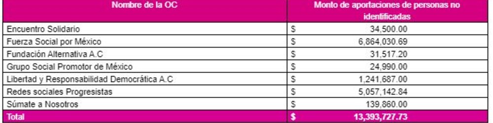 En la fiscalización realizada por el INE, la autoridad electoral encontró en los registros contables de todas las organizaciones aportaciones por parte de personas no identificadas por un total de 13.3 millones de pesos.