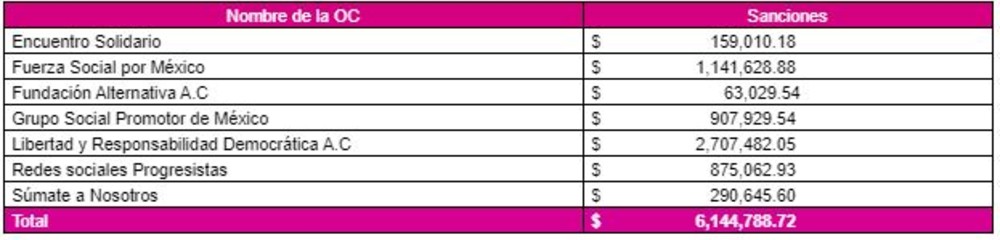 El Consejo General del Instituto Nacional Electoral (INE) aprobó sanciones por las irregularidades encontradas en la revisión de los informes mensuales de ingresos y egresos de siete organizaciones que presentaron solicitud formal para obtener su registro como partido político nacional, por un monto global preliminar de 6.14 millones de pesos.