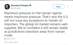 La administración del presidente Donald Trump “ha llevado las exportaciones de petróleo de Irán a mínimos históricos”, señaló el secretario de Estado, Mike Pompeo, en un comunicado.