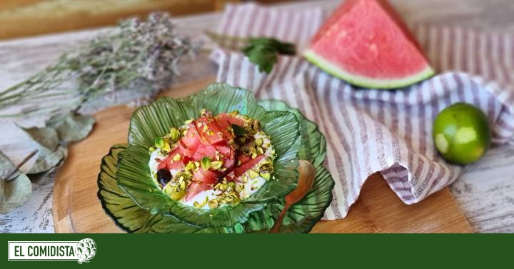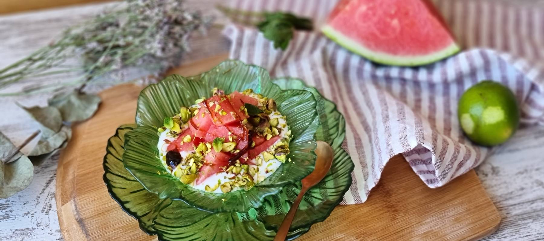 Poner en los boles una base de la crema de yogur y mascarpone, encima los daditos de sandía, un poco de melaza y terminar con la ralladura de la lima y el pistacho picado.