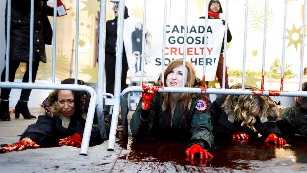 La organización de Personas por el Trato Ético de los Animales (PETA) realizó este jueves una “sangrienta” protesta frente a una tienda de la cadena Nordstrom en Nueva York a la que exhortó a cesar la venta de chaquetas de la marca Canada Goose, confeccionadas con pieles de animales.