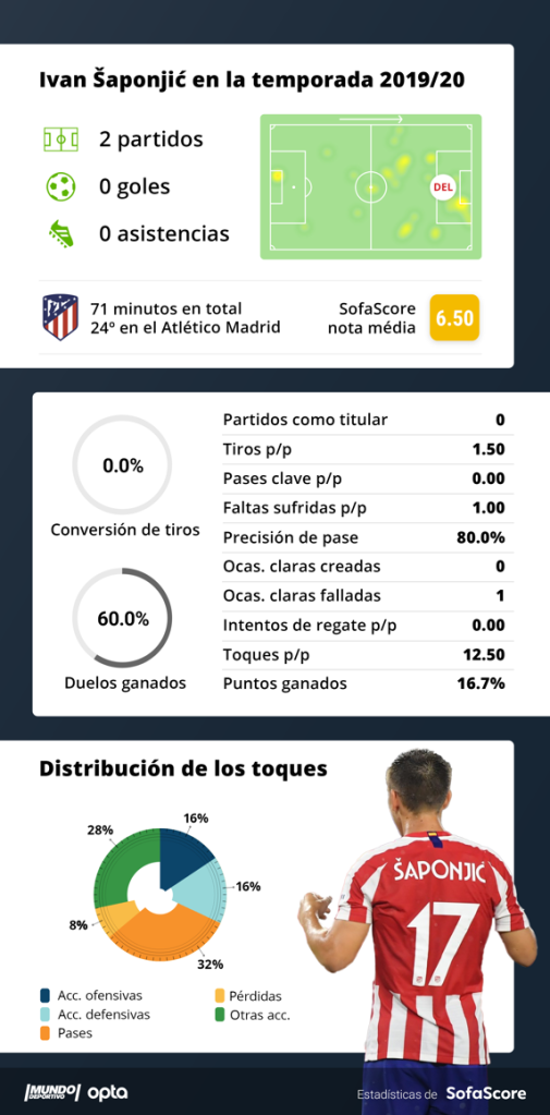 Desde entonces, Saponjic no ha vuelto a jugar. 71 minutos repartidos en dos partidos en toda la temporada. Números muy alejados de lo que se esperaba del cuarto delantero de un equipo que, además, apenas ha podido contar con Costa en este curso, en el que Morata y Joao Félix también se han perdido varios partidos por lesión y sanción. Obviamente, es el jugador que menos participación ha tenido de toda la plantilla.