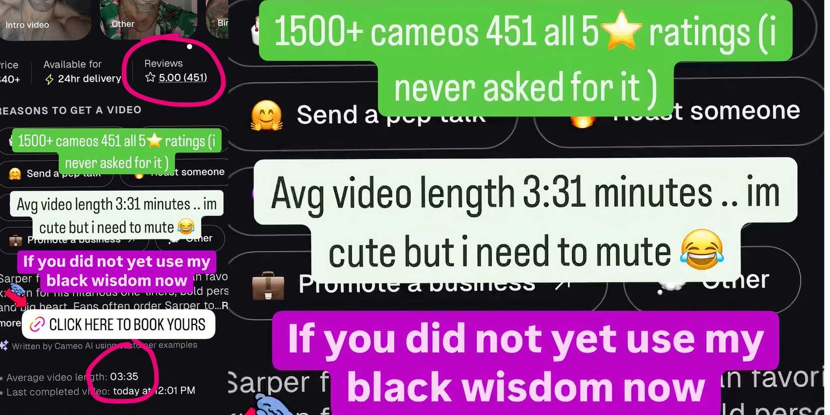 Recientemente, Sarper Anunció un logro profesional significativo en las redes sociales, compartiendo que ha ganado popularidad en cameo. Sarper reveló que ha creado miles de videos personalizados para sus fanáticos, con “Más de 1500 cameos 451 las 5 calificaciones”. No solicitó estas calificaciones. Sarper alentó a sus fanáticos a reservar más de sus cameos para beneficiarse de su “Sabiduría negra”. Mencionó, “AVG Longitud de video 3:31 minutos … soy lindo pero necesito silenciar”, lo que implica que puede hablar demasiado en sus clips de cameo.