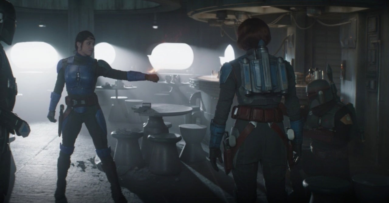 El impacto destrozó la mesa, y luego los dos se dieron la vuelta rápidamente y se apuntaron entre sí con sus guanteletes lanzallamas antes de que Bo-Katan disolviera la pelea.
