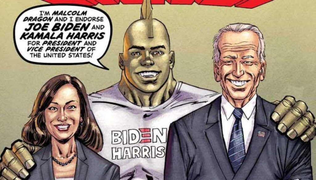 Image Comics reveló hoy una portada alternativa a Dragón salvaje # 253, con Malcolm Dragon respaldando a Joe Biden y Kamala Harris para presidente y vicepresidente de los Estados Unidos en las elecciones de 2020. La imagen evoca una portada memorable con el padre de Malcolm, el Dragón titular original de la serie, respaldando al entonces candidato Barack Obama a la presidencia en 2008. Si bien es poco común, por razones comerciales y creativas, que un cómic de superhéroes convencional ver su carácter respaldando explícitamente a un candidato a un cargo, Dragón salvaje está ambientado en tiempo real, en una versión ficticia del mundo real y, como resultado, a menudo refleja el mundo un poco más directamente que la mayoría.