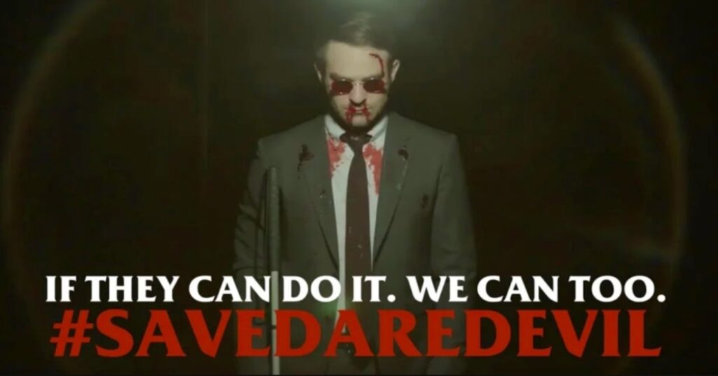 “Si pueden hacerlo. Nosotros también podemos. #SaveDaredevil”, se lee en una imagen hecha por un fan publicado en un Temerario-céntrico en Reddit. En Twitter, donde los miembros de un movimiento para salvar el programa se organizaron por primera vez, los fanáticos de Temerario continúe publicando tweets diarios utilizando el hashtag designado que ha recibido el apoyo de la estrella de cine de Marvel Tom Hiddleston y la estrella de la serie Charlie Cox.