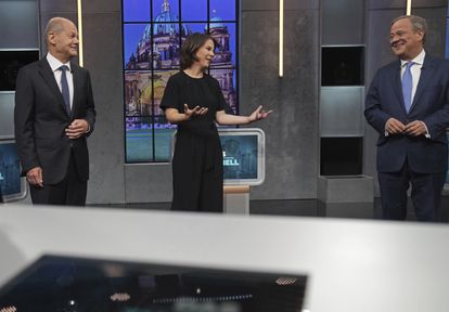 Los vientos de cambio soplan cada vez con más fuerza en la política alemana. El tercer debate entre los dos hombres y la mujer que aspiran a liderar el país no ha movido este domingo ni un milímetro las expectativas de los contendientes. Y, a solo una semana de las elecciones, todo lo que suene a inmovilismo tiene ahora mismo un único beneficiado: el socialdemócrata Olaf Scholz. Nada más terminar el programa, una encuesta ha confirmado la muy amplia distancia del favorito. Un 42% cree que Scholz ganó el debate frente al 27% que apuesta por el democristiano Armin Laschet y el 25% por la verde Annalena Baerbock.