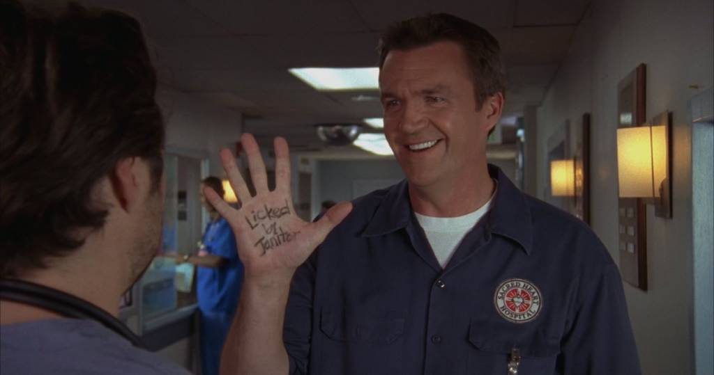 En el episodio “My Overkill”, después de rociar a JD con agua para que pareciera que se mojó, lo rocía con un químico desconocido que comienza a quemar su piel. Del mismo modo, en el episodio de la cuarta temporada “My Office”. el conserje “accidentalmente” lo rocía con amoníaco, un químico que puede causar ardor y, en casos extremos, ceguera y daño pulmonar.