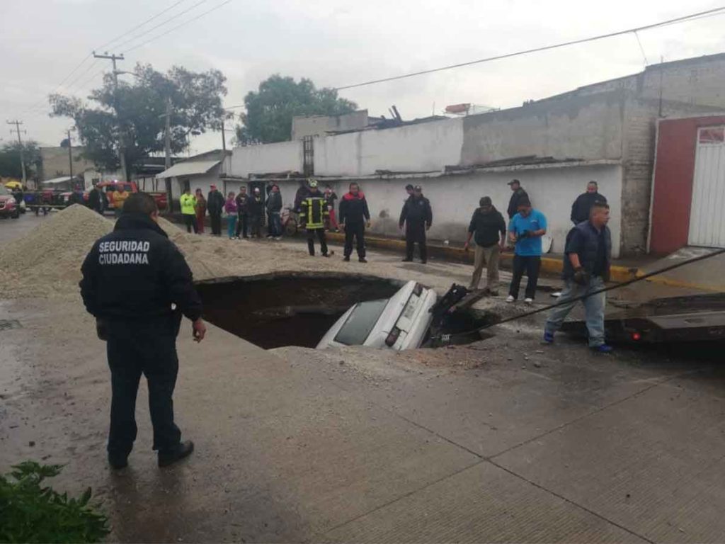 Dos conductores de dos vehículos particulares cayeron en un socavón de cerca de tres metros de profundidad, el cual se formó en calles de la colonia El Chamizal de Ecatepec, Estado de México.