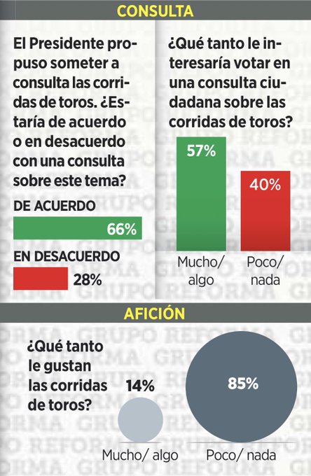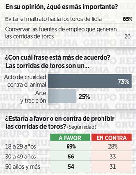 Este martes, el periódico Reforma se adelantó a la consulta y publicó una encuesta realizada a 500 adultos a nivel nacional, en la que 59% por ciento se dice a favor de prohibir las corridas, mientras 31% está en contra.