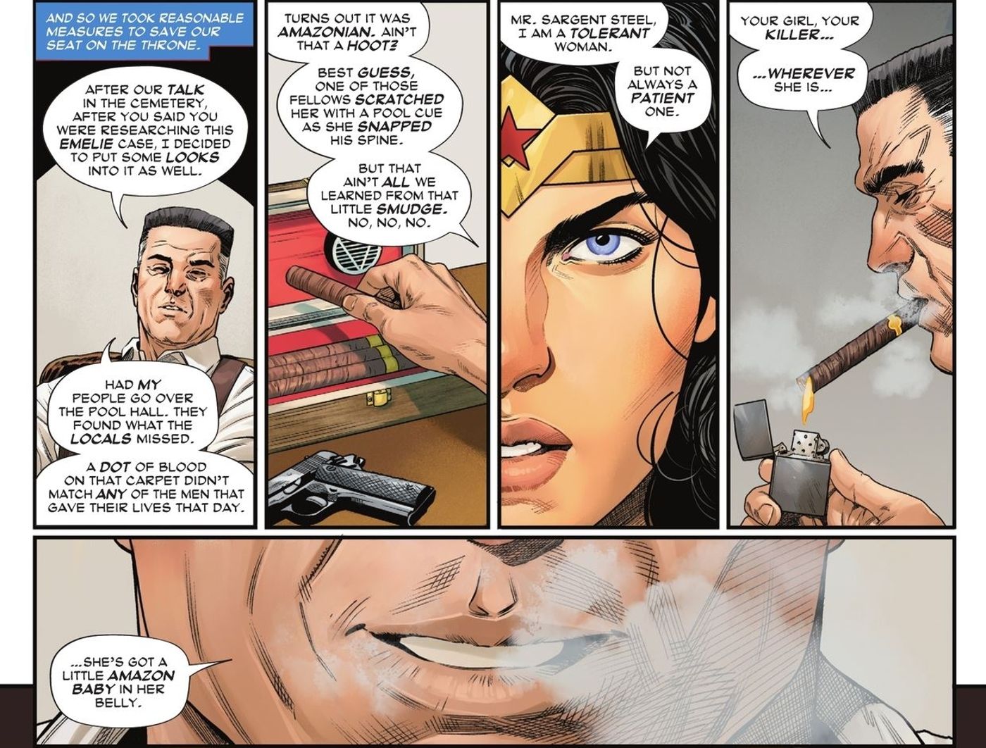 “/> Wonder Woman se reúne con Sarge Steel para descubrir qué sabe sobre la antigua rival de Diana, Amazon Emelie. Después de un breve enfrentamiento, Steel cede y revela un informe médico. Una muestra de sangre recuperada de los asesinatos en el salón de billar resultó ser la de Emelie. la sangre también reveló que Emelie está embarazadaun giro que sorprende a Trinity mientras escucha esta historia.