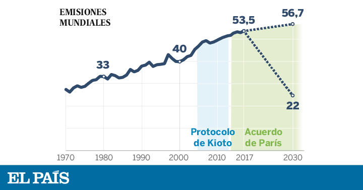 Tras la firma del Acuerdo de París, que recoge los esfuerzos a los que están dispuestos a llegar los países para que el cambio climático se quede dentro de unos márgenes asumibles, parecía que las emisiones mundiales habían entrado en fase de estancamiento. Pero fue un espejismo y en 2018 volvieron a aumentar. La previsión, según los planes presentados por todos los países firmantes de París, es que para 2030 sigan creciendo, cuando lo que tendrían que hacer es reducirse radicalmente, hasta un 45% respecto a 2010, y prácticamente desaparecer en 2050. Esa es la ruta necesaria si se quiere que el incremento de la temperatura no alcance niveles tan catastróficos: el objetivo es que el aumento medio no supere los 1,5 grados respecto a los niveles preindustriales. A estas alturas del siglo XXI ya ha aumentado un grado centígrado.