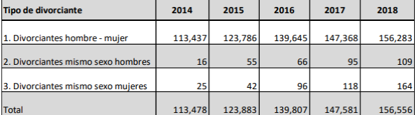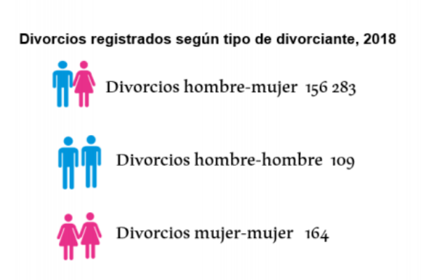 Asimismo, de los 156 mil 556 divorcios del año pasado, 156 mil 283 correspondieron a hombre-mujer, 109 hombre-hombre y 164 mujer-mujer.