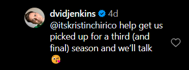 Tras la liberación de Nuestra bandera significa la muerte En el tráiler de la temporada 2, Jenkins respondió a un comentario de la comediante y escritora Kristin Chirico en un carrete de Instagram.