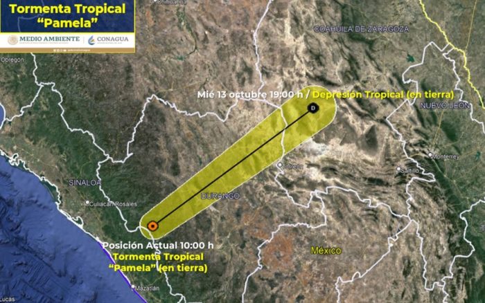 Luego de tocar tierra como huracán en Sinaloa, “Pamela” se debilitó esta mañana a tormenta tropical y avanza sobre Durango.