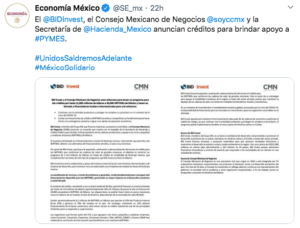 Incluso, la Secretaría de Economía tuiteó el domingo: “El @BIDInvest, el Consejo Mexicano de Negocios @soyccmx y la Secretaría de @Hacienda_Mexico anuncian créditos para brindar apoyo a #PYMES. #UnidosSaldremosAdelante #MéxicoSolidario”.