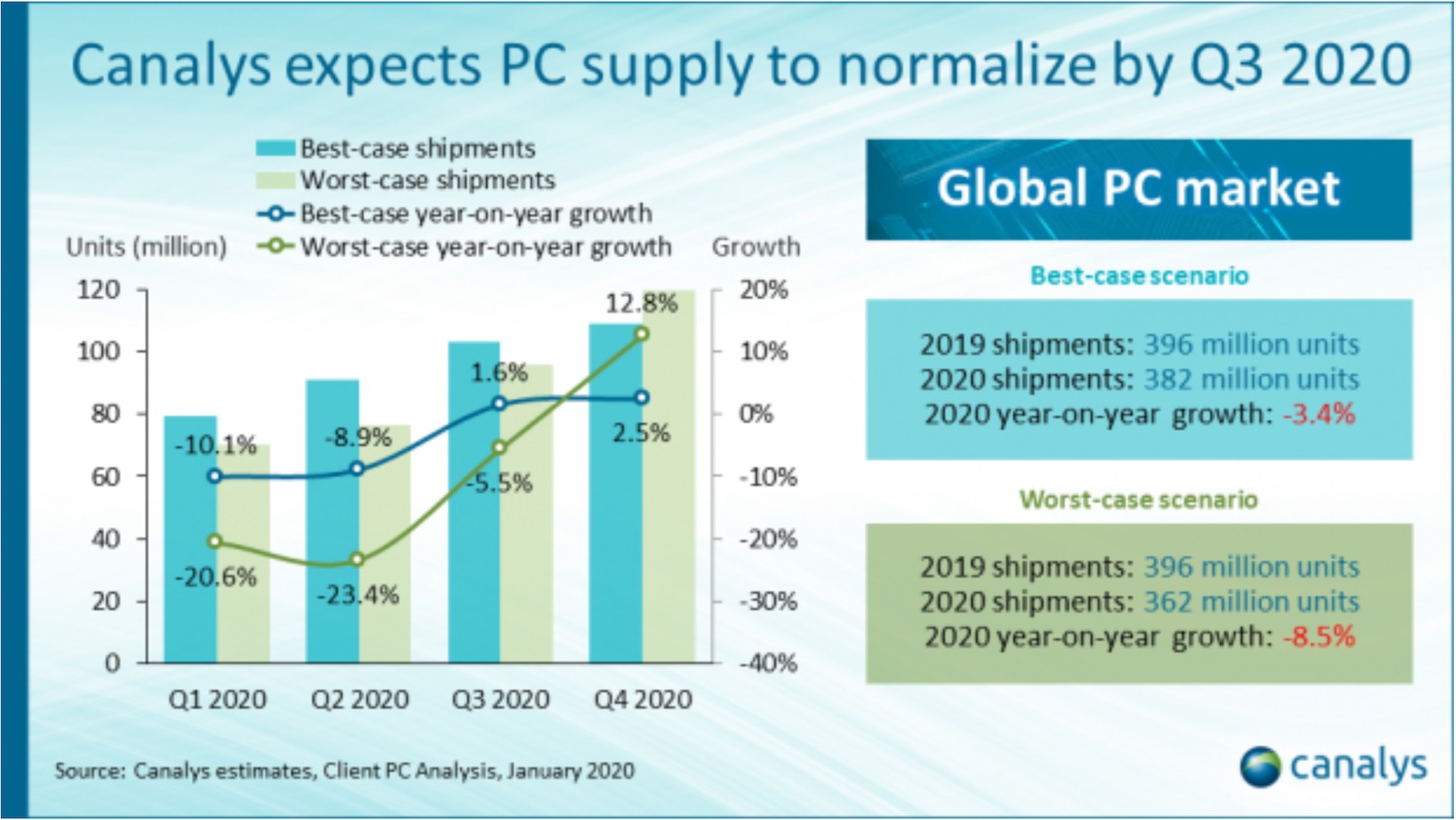 “Por lo tanto, se espera que los envíos mundiales del PC disminuyan 3.4% año tras año en 2020, con el primer trimestre de 2020 en un 10% y el segundo trimestre de 2020 en un 9%. La oferta del mercado de PC se normalizará en el tercer trimestre de 2020. Anualmente, Canalys espera que el mercado mundial de PC comience lentamente su recuperación a partir de 2021 ”.