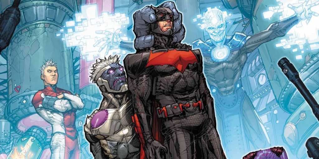A pesar de las sombrías probabilidades y la falta de armonía del grupo, la nueva Liga de la Justicia derrota a los Cinco, pero enfrenta otras amenazas. los Liga de la justicia 3000 Batman también recibió un rediseño ingenioso, con su logotipo y capa con colores rojos. Esta versión distintiva del traje apareció más tarde como una máscara para el videojuego. Batman: Arkham Knight.