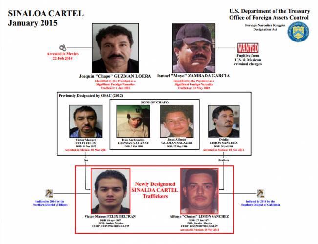 En la misma acusación figuran el hijo del “Chapo”, Jesús Alfredo Guzmán Salazar, alias “Alfredillo”; Heriberto Zazueta Godoy, alias “Capi Beto”; Jesús Raúl Beltrán León, alias “Trevol” o “Chuy Raul”; Héctor Miguel Valencia Ortega, “MV”; Jorge Mario Valenzuela Verdugo, “El Choclos” y Guadalupe Fernández Valencia.