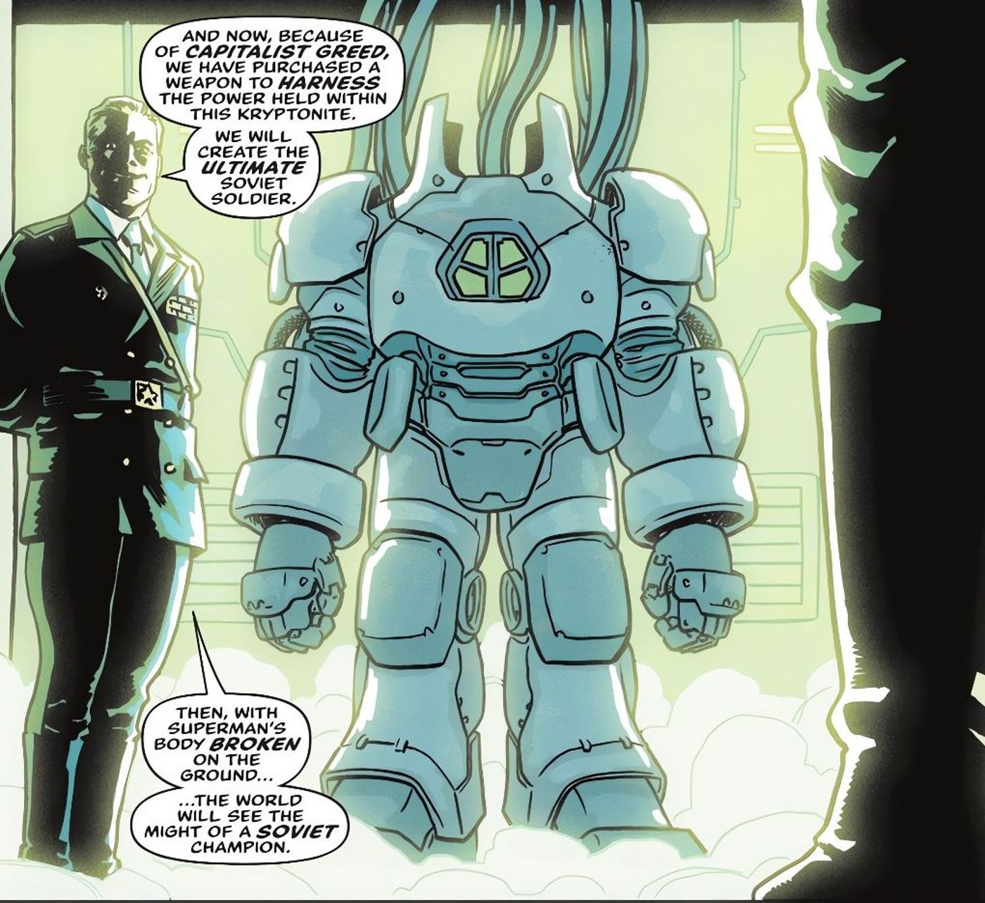 - El cómic lleva a los lectores a la era de la Guerra Fría y presenta a Metallo como un soldado ruso, parte del plan de la URSS para rivalizar con el poder de Superman.
