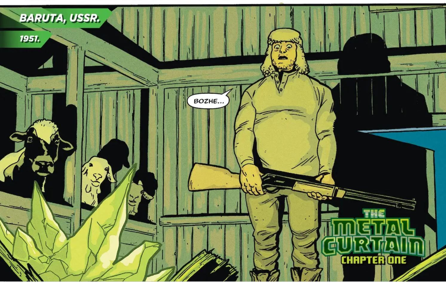 En Superman ’78: La cortina de metal #1 Por Robert Venditti y Gavin Guidry, se ve un trozo de kriptonita lanzándose al espacio después de la destrucción de Krypton. El trozo de roca verde brillante aterriza en una pequeña granja en la URSS mientras un granjero tropieza con el regalo del cielo.
