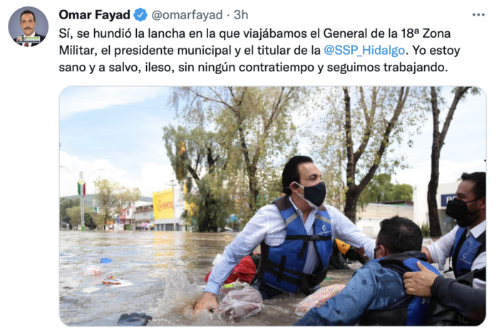 El gobernador de Hidalgo, Omar Fayad Meneses, informó que la lancha en la que recorría las zonas afectadas tras las fuertes lluvias registradas en Tula.