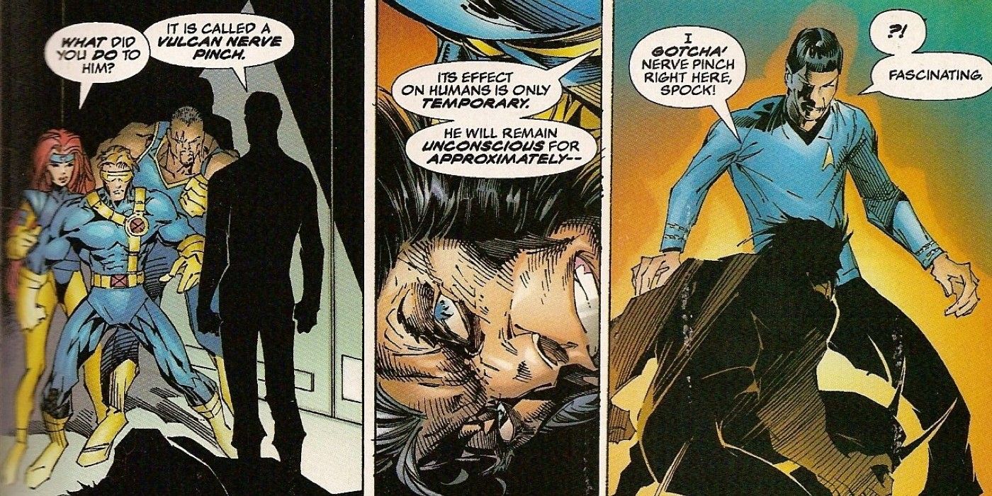 Star Trek/X-Men fue escrito por Scott Lobdell y dibujado por Marc Silvestri, entre otros. Los X-Men, persiguiendo al mutante Proteus, llegan a bordo del Empresa USS. Spock y Wolverine pelean, y Vulcan le da a Logan el característico Nerve Pinch. Spock le dice a Wolverine el nombre de la maniobra y el mutante cae… por un breve segundo. Logan retrocede, con las garras desenvainadas y listo para destrozar a Spock.