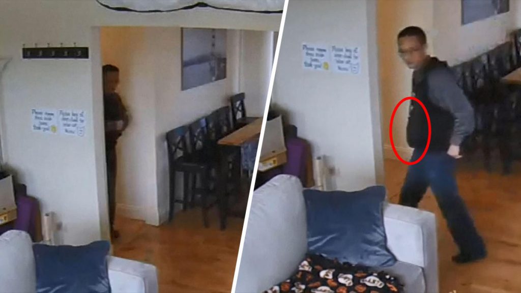 La cámara de seguridad de la vivienda captó los momentos en cuestión y la policía local asegura que el hombre tenía un “bulto notable alrededor de su abdomen que no tenía cuando primero entró a la vivienda”.