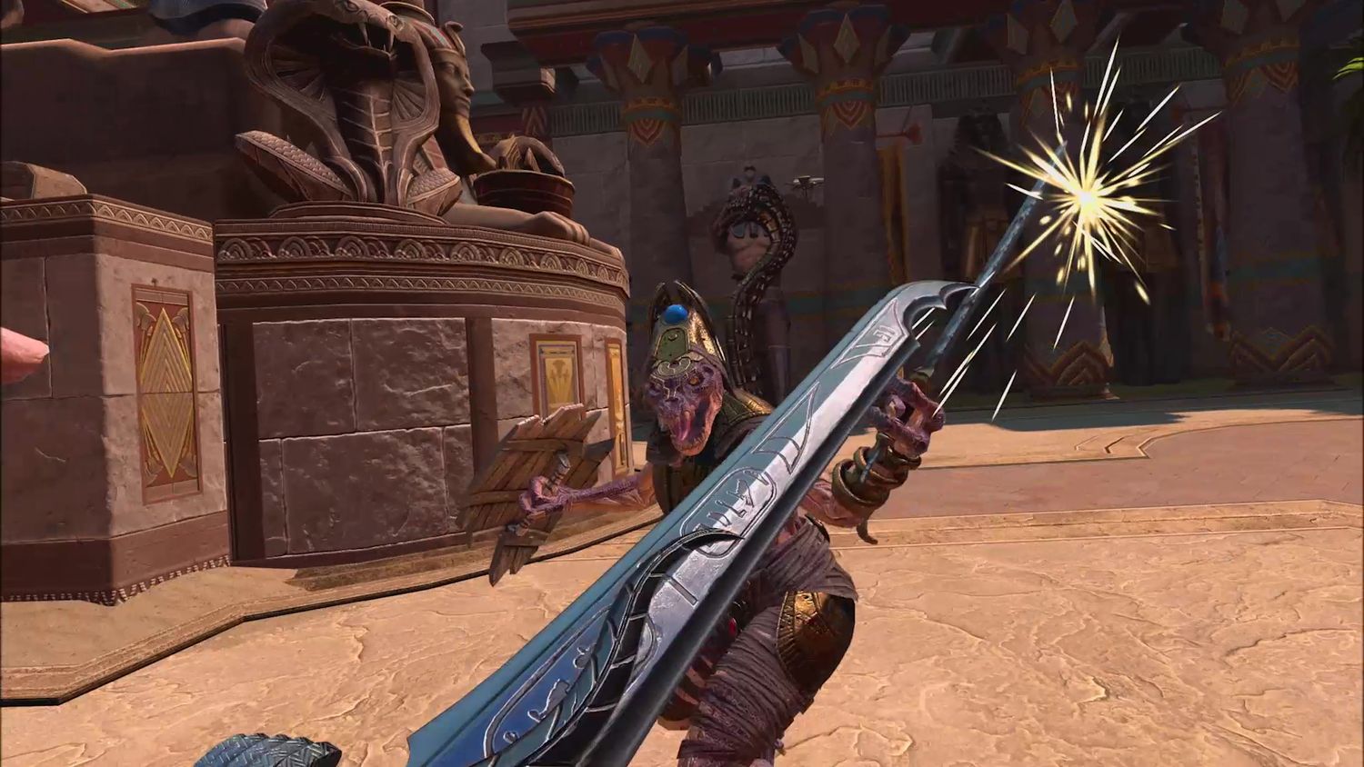 Los enemigos se revelaron en varios momentos, aunque la lista de nuestra vista previa consistía principalmente en el ejército de hombres lagarto de Set. Eran espadachines sorprendentemente capaces, levantaban un escudo para aplazar los golpes y preparaban fuertes ataques que podían ser detenidos o esquivados mientras nos movíamos por las salas del templo. Los escudos se pueden romper en pedazos con suficientes movimientos, pero la IA enemiga se modifica (al menos en el nivel de dificultad medio) para responder inteligentemente y adaptarse a los perezosos usuarios de realidad virtual o a los ataques spam; saludan este acercamiento con un ataque de empujón deliciosamente crujiente, e incluso pueden sacar el hacha de Abraxas de su escudo y arrojársela de regreso al remitente.