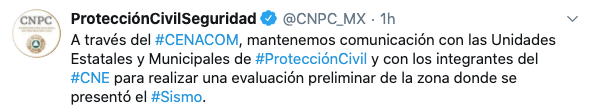 Protección Civil apuntó que mantiene comunicación con las Unidades Estatales y Municipales de y con los integrantes del CNE para realizar una evaluación preliminar de la zona donde se presentó el sismo.