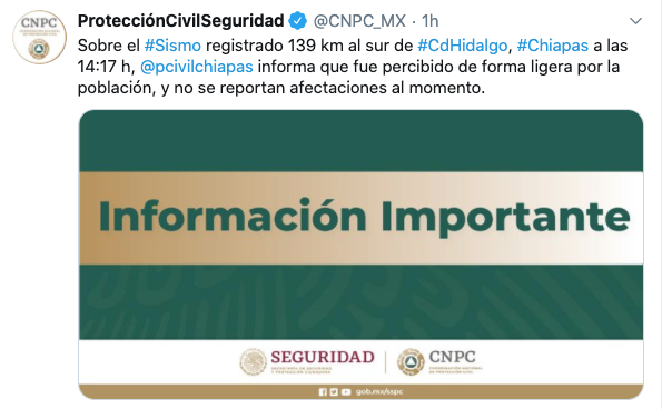Con base en la información preliminar del #Sismo registrado 139 km al sur de #CdHidalgo, #Chiapas a las 14:17 h, el Centro de Alerta de Tsunamis #CAT de @SEMAR_mx notifica que NO se espera la generación de un #Tsunami. pic.twitter.com/0pDy1Xa9KT