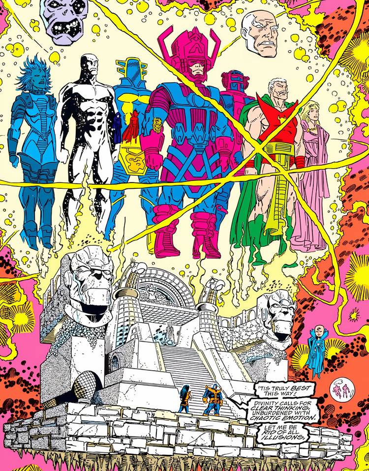 Desafortunadamente, Galactus y sus compatriotas no corren mejor suerte y, después de una violenta escaramuza de proporciones cósmicas, Thanos usa su nuevo poder para petrificar a sus oponentes omnipotentes.Y al hacerlo, Thanos demuestra cuán poderoso es el Guantelete.
