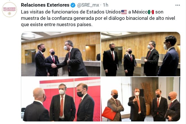 “Las visitas de funcionarios de Estados Unidos a México son muestra de la confianza generada por el diálogo binacional de alto nivel que existe en nuestros países”, publicó sobre el encuentro la Secretaría de Relaciones Exteriores, a través de su cuenta de Twitter.
