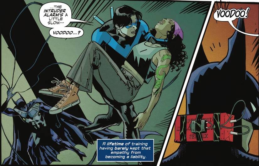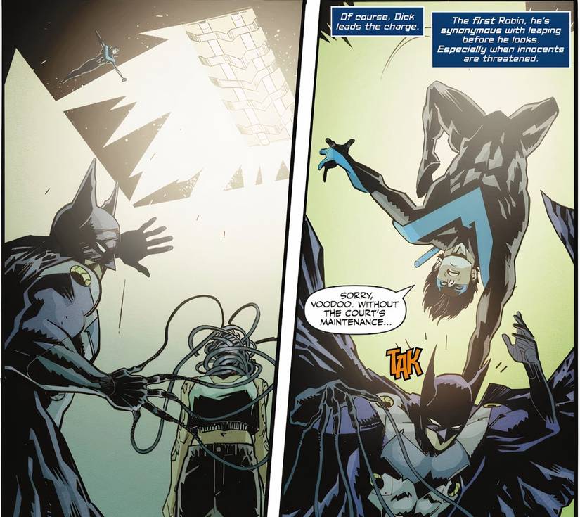 Mientras Failsafe comienza a luchar contra Nightwing, el monólogo interno del primero revela un par de ideas interesantes sobre Dick: “El primer Robin es sinónimo de saltar antes de mirar. Especialmente cuando los inocentes están amenazados. Toda una vida de entrenamiento apenas ha evitado que esa empatía se convierta en una desventaja”. El monólogo de Failsafe deja en claro que considera la empatía de Dick como una debilidad, un factor que tiene en cuenta al planificar su ataque. Más adelante en la pelea, la imitación de Batman le rompe brutalmente el brazo a Miss Martian, dejando fragmentos de hueso expuestos. Este es un movimiento calculado para explotar la empatía de Dick y desestabilizar al héroe.