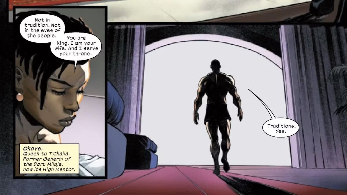 Pantera Negra Definitiva #1 ve a T’Challa casado con una mujer que ha visto en la continuidad principal como una verdadera amiga y nada más. Sin embargo, Okoye tiene todas las características de un maravilloso interés amoroso para Black Panther. Muchos de los amores de T’Challa han sido mujeres increíblemente poderosas y con dones extraordinarios como Tormenta de los X-Men y Nakia. Al igual que Storm, Okoye es una heroína nacida en África cuya lealtad está con su pueblo y vive para protegerlos pase lo que pase. Dura y rígida por fuera, Okoye finalmente puede mostrar su comportamiento más suave como Reina mientras consuela a su conflictivo marido.