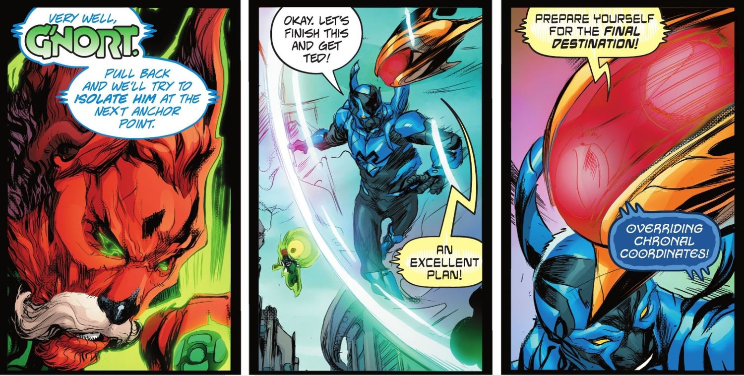 En Escarabajo azul #7 Por Josh Trujillo, Scott Kolins, Cully Hamner, Howard Porter, Adrián Gutiérrez y Natacha Bustos, Blue Beetle es involucrado en una misión de rescate por Booster Gold para salvar a Ted Kord. La esencia de Kord se ha dispersado a lo largo del flujo temporal, lo que obligó al dúo a viajar a múltiples eras del Universo DC.